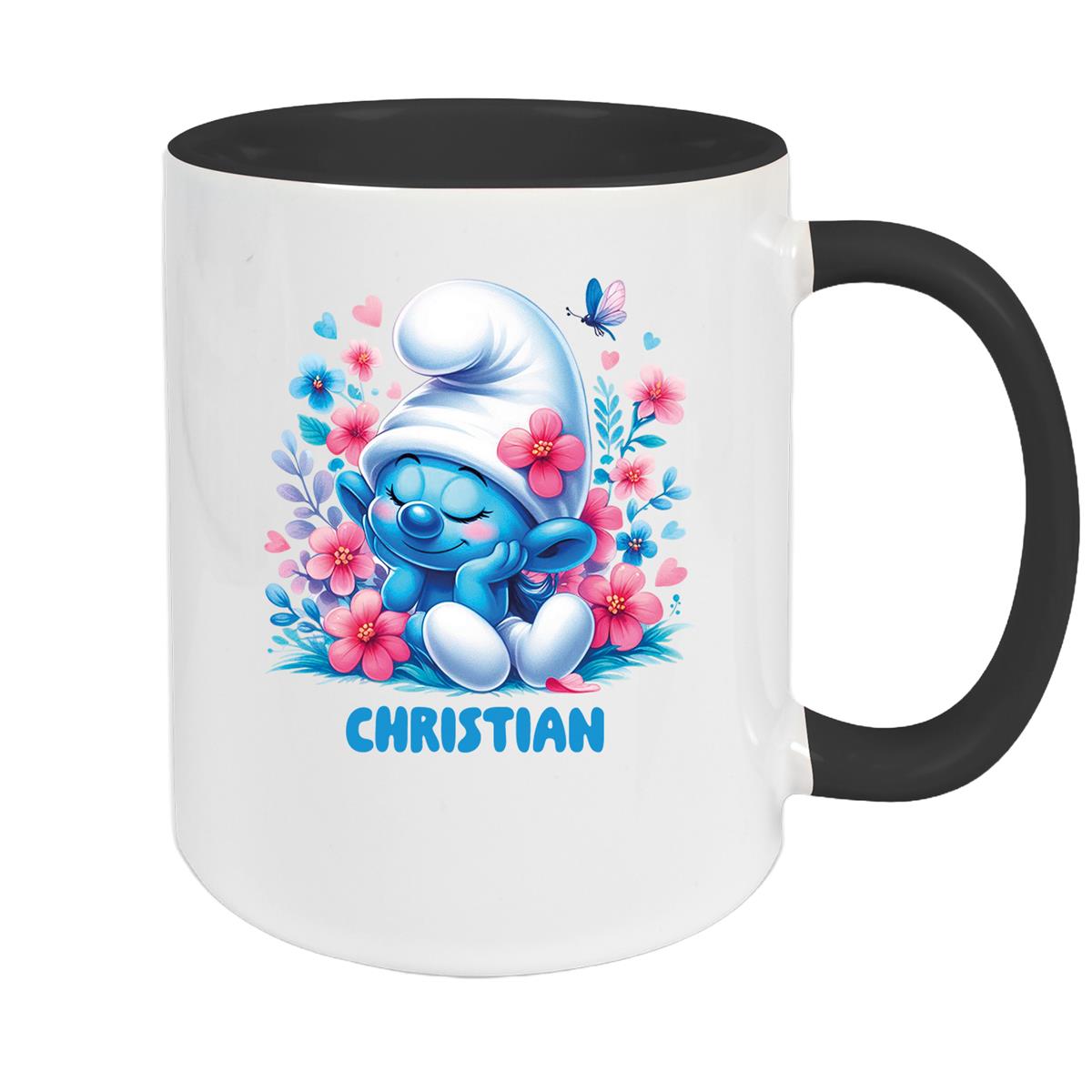 Tasse Kinder Schlumpf 1 mit Blumen Wunschname Keramik Kinderbecher personalisiert versch. Farben