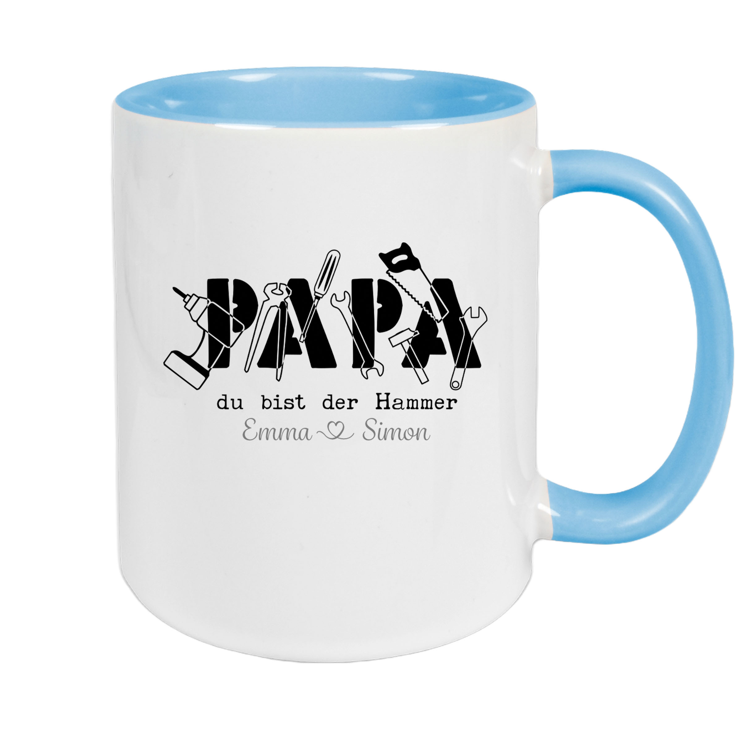 Tasse Vatertag 9 Papa, "Du bist der Hammer" Wunschnamen Keramik Personalisiert versch. Farben