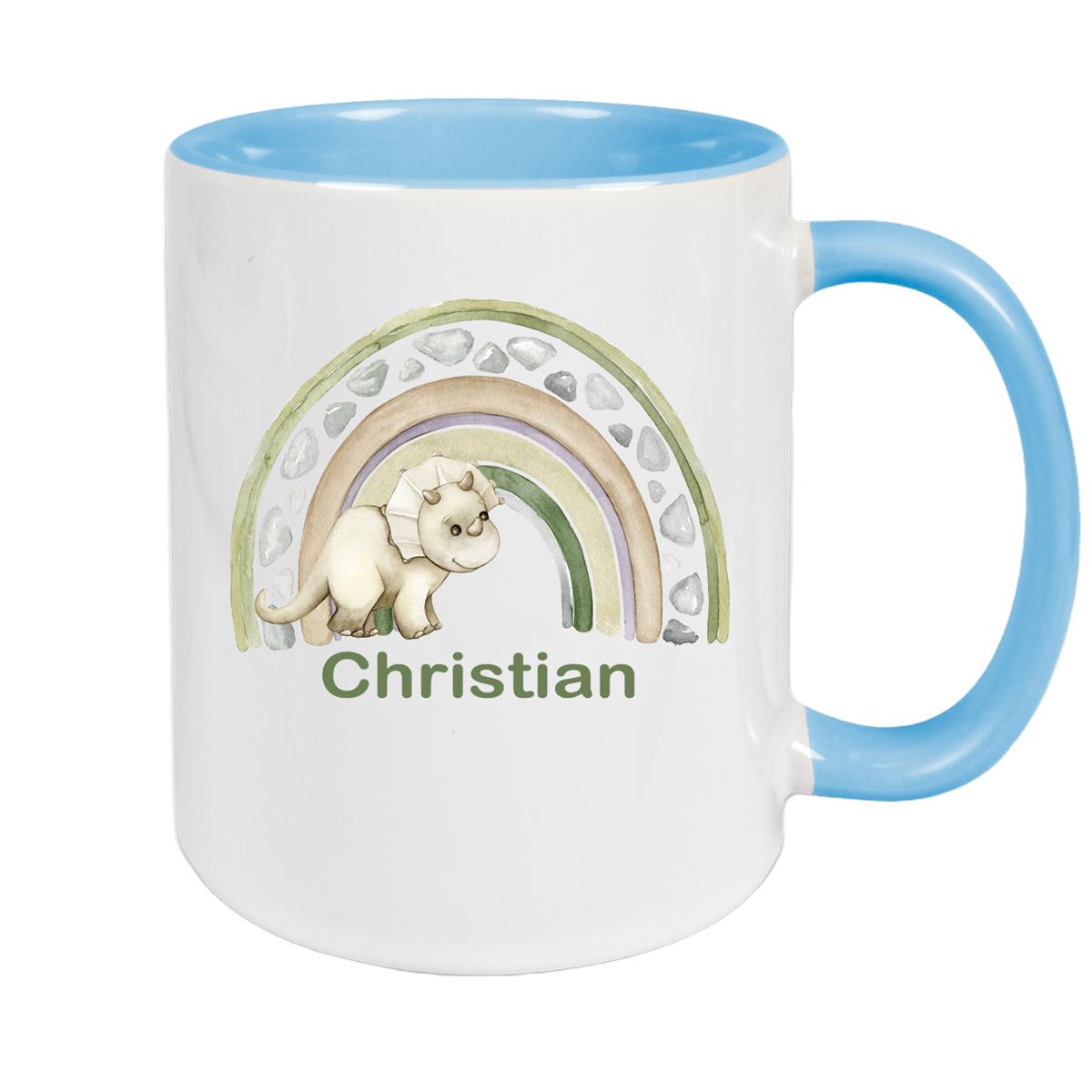 Keramiktasse Regenbogen-Dino – mit deinem Namen personalisiert